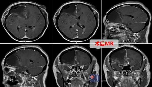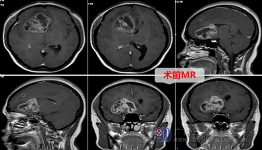 外十科主任欧阳辉教授热情地将她收住院。入院后欧阳主任结合磁共振、CTA等影像资料分析指出:患者右侧额颞岛叶占位性病变,病变范围广、是跨脑叶肿瘤,考虑成人弥漫性胶质瘤,应该尽快做手术。于是外十科团队很快为患者做好了术前准备,于第二天在全麻下行右侧额颞岛叶-胼胝体膝部-基底节区胶质瘤切除术。