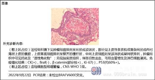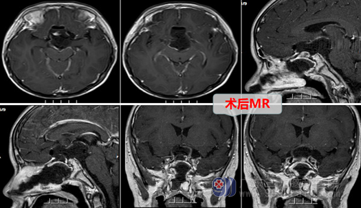 因为小袁已经双眼几近失明,所以加急,在入院的第三天医生就为小袁在全麻下进行了手术,手术方式选择的内镜扩大经鼻蝶鞍上区颅咽管瘤切除术,这属于微创手术,不需要开颅,所以恢复起来比较快。术中扩大经蝶,在内镜直视下,精细分离肿瘤囊壁,解除肿瘤对视神经-视交叉的压迫,并且保护好下丘脑与垂体柄。并且手术很成功,术后的MR提示原病灶已经切除,病理结果提示:造釉细胞型颅咽管瘤,CNS WHO 1级。