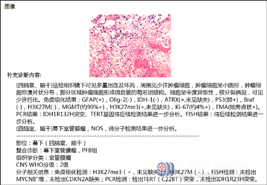 入院后,主管医生邓心情在对劳女士进行一系列相关检查,外十科在欧阳辉主任的带领下,对劳女士的病情仔细分析、讨论,认为劳女士的肿瘤大,主体位于第四脑室,与脑干关系密切,属于脑干-四脑室肿瘤,必须手术治疗,但由于肿瘤可能从脑干长出,手术风险很大。在完善相关术前准备,确认劳女士无手术禁忌症后,医生详细向其家属解释了病情,说明了手术的必要性和危险性。在征得患者及其家属的理解和同意后,外十科为其进行了“后颅窝开颅,脑干-第四脑室内占位切除术”,术中见肿瘤确实是从第四脑室底延髓背侧长出,肿瘤与脑干黏连,欧阳辉教授在显微镜放大下,剖开小脑下蚓部,沿肿瘤周边游离,精准、分块切除肿瘤,术中冰冻结果提示:低级别神经源性肿瘤(最后常规病理证实为室管膜瘤),医生如履薄冰、如临深渊,虎口拔牙,细心切除肿瘤大小约4*4*3cm,相邻脑干、血管解剖保护良好。手术顺利成功,现劳女士各方面恢复良好,无手术并发症发生。