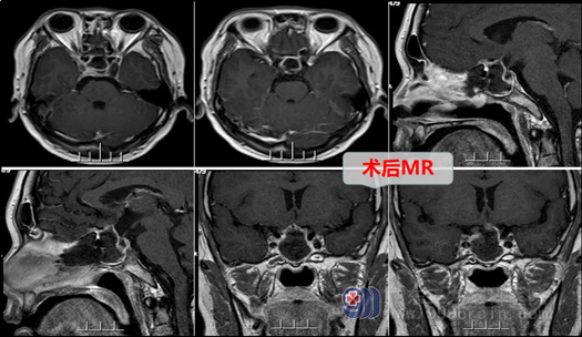 结合患者症状、体征、头颅MR检查,本院头MRI结果示:鞍区病灶--垂体瘤,蓝先生症状明显,有内分泌紊乱,有手术指针。欧阳教授与神经外十科医疗小组分析、讨论后决定:实施手术—“神经内镜下经鼻腔-蝶窦垂体病损切除术” 。术中,在内镜直视下分开鼻中隔粘膜,磨开鞍底骨质,形成鞍底骨窗约1.5cm大小。钩刀“+字型”全层切开硬脑膜。见肿瘤灰白色,质软,正常垂体组织位于左后方,全切肿瘤,鞍膈塌陷,双侧海绵窦内侧壁无肿瘤残留,正常垂体保护良好,无脑脊液漏。术后第二天,患者神志清醒,查体合作,语言清晰,问答切题。