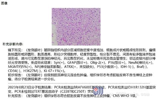 入院后找到了我科的欧阳辉教授,欧阳辉教授和其主治医生看了该患儿的检查片子,为其父母解释道:她的左侧额叶有范围约17×19mm的结节占位病变,考虑低级别神经上皮肿瘤的可能,有明确的手术指征。外十科医生于8月15号为该患儿进行“左侧额叶占位病变切除术”,手术很顺利,病理报告:符合胚胎发育不良性神经上皮肿瘤(DNT)。现在患儿恢复良好,已经出院。