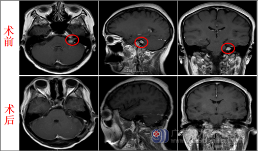 入院后陈阿姨找到了欧阳辉教授,欧阳教授看了陈阿姨拍的MR片子解释道:陈阿姨左侧桥小脑角区有一个占位,考虑听神经鞘瘤可能性大,现在已经影响到陈阿姨的听力,手术指征明确,遂安排陈阿姨住院,完善相关检查,于9月18号在全麻全程电生理监测下行“左侧听神经鞘瘤切除术 ”。术中,医生先暴露桥小脑角池肿瘤,再小心磨开内听道后壁,在高清显微镜下细心保护好后组颅神经、三叉神经,精准解剖面、耳蜗神经,均予以完全保留,肿瘤全切除。手术很顺利,现陈阿姨恢复良好,完全没有面瘫。