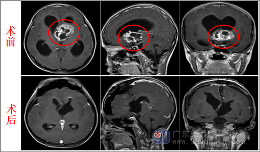 幸运的是,小芳的家人在医院找到了经验丰富的神经外科医生。在充分了解病情后并完善术前准备后,欧阳辉教授带领外十科团队决定采用直接手术的方式为小芳进行治疗。头颅MR示:1.鞍上区至透明隔区占位性病变,考虑毛细胞星形细胞瘤可能性大;2.幕上梗阻性脑积水并室周间质水肿。患儿术前已经非常虚弱,脑积水严重,已有脑疝前期表现。 手术指征明确。9月27日外十科在全麻下为患儿行经右侧前纵裂-胼胝体-侧脑室入路行鞍上区-透明隔占位切除术,肿瘤位置深,手术难度大。医生如履薄冰、如临深渊,在高清显微镜下,小心翼翼地切除肿瘤,保护好大脑内静脉等重要血管及下丘脑等重要神经结构,最终将肿瘤全切除。术后病理为:毛细胞粘液性星形细胞瘤可能性大。术后小芳很快清醒,解除了危险,现小芳恢复良好,已转肿瘤科行后续治疗。