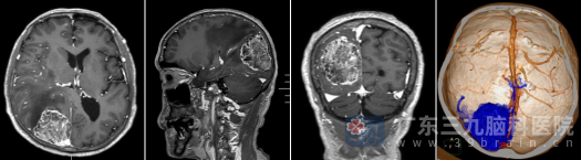 进一步的检查揭示了这场战役的艰巨性。术前MR显示,这个位于右侧顶枕部的巨大团块信号混杂,血供丰富,周围脑组织水肿严重。更关键的是,术前CTA发现,肿瘤不仅紧贴着大脑最重要的血液回流通道——上矢状窦,还将其部分包绕,区域内血管纵横交错。这意味着手术稍有不慎,就可能引发出血难止或静脉回流障碍,导致严重脑水肿甚至生命危险。