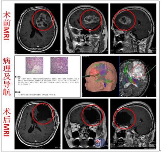 完善相关检查后,由鲁明副院长主刀,在全麻下行“左侧额岛叶-基底节区胶质瘤切除术”,导航定位肿瘤,术中见肿瘤位于左侧额岛叶、左侧基底节-胼胝体区,呈灰白色,质韧,血供丰富,显微镜下扩大切除。手术历时6个半小时,过程顺利。术后病理:胶质母细胞瘤,IDH突变型,WHO IV级。