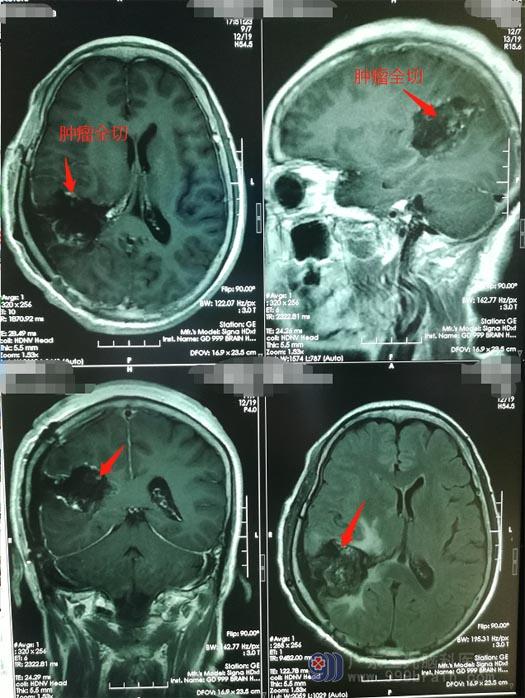 医院副院长、神经外五科主任鲁明认为患者的右侧颞顶叶占位考虑胶质瘤,肿瘤体积大,约50mm×39mm×47mm,手术指证明确,可以择期手术。术前准备妥当后,在全麻下行“右侧颞顶叶、侧脑室后角占位性病变切除术”,经过5个小时的奋战,顺利完成手术。术后MRI显示肿瘤已全部切除。