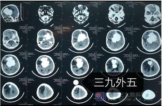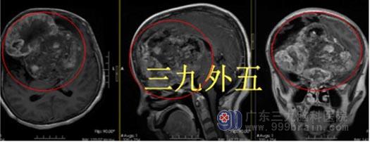 近30年了,这个肿瘤一直在区女士的脑子里。直到最近,她出现右眼看不清,左手左脚没力气,走路走不稳。一周前食物吞不下,精神越来越差,丧失了生活自理能力,家人才带着她来到广东三九脑科医院,磁共振检查结果显示肿瘤大小约11.8cm×9.2cm×9.7cm。