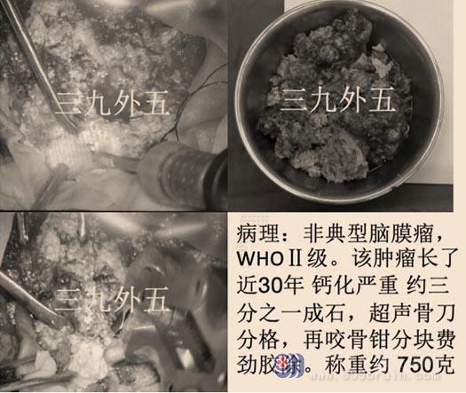 由于肿瘤生长时间长,体积巨大,是罕有的病例。综合神经外科的专家们集体讨论,制定了详细的术前计划、手术方案及替代方案。在充分的术前检查与准备后,鲁明副院长主刀行“右侧额部巨大占位性病变切除术”。手术中见肿瘤广泛侵犯脑组织、周边许多重要血管与神经组织,手术难度很大。并且,肿瘤的质地十分坚硬,手术中使用超声骨刀分格与咬骨钳费劲绞除。经过近12个小时的艰辛努力,终于顺利将肿瘤完整切除。切出的肿瘤钙化严重,重达750g!