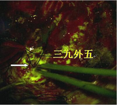 黄荧光引导下切除肿瘤组织(白色箭头所示)