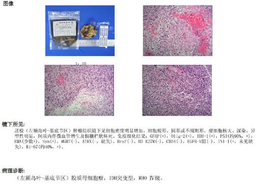 完善相关检查后,由综合神经外科鲁明副院长主刀,在全麻下行“左侧额岛叶-基底节区胶质瘤切除术”,导航定位肿瘤,术中见肿瘤位于左侧额岛叶、左侧基底节-胼胝体区,呈灰白色,质韧,血供丰富,显微镜下扩大切除。手术历时6个半小时,过程顺利。术后病理:胶质母细胞瘤,IDH突变型,WHO IV级。