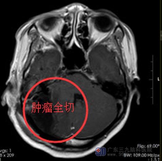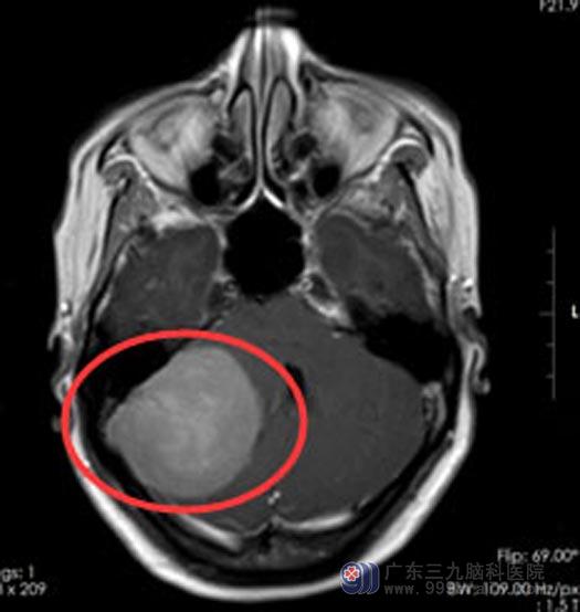 广东三九脑科医院头颅MR检查结果提示:右侧桥小脑角区一类圆形占位性病变,大小约37cm×52cm×47cm ,诊断为:右侧桥小脑角占位,考虑为脑膜瘤。