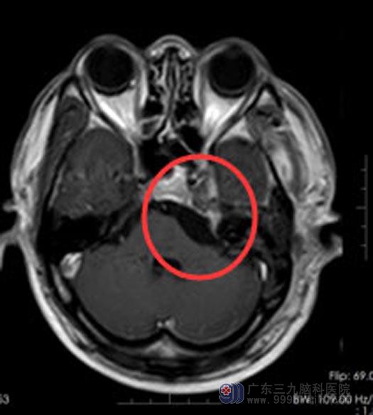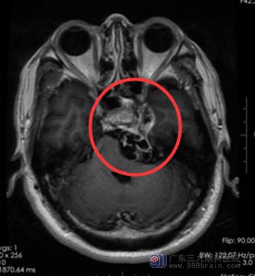 一个月前,症状变得越来越重,不但发作频繁还出现了头晕。后来,听朋友介绍,赵先生来到了广东三九脑科医院综合神经外科。MR结果示:左侧鞍旁至左侧桥小脑角区囊实性占位性病变,考虑三叉神经鞘瘤。