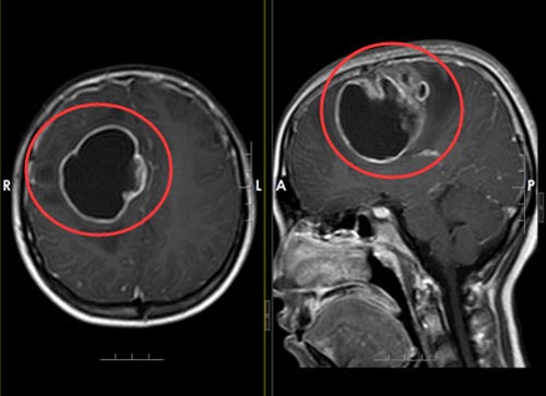 进一步头颅MR平扫+增强提示:右额叶巨大囊实性占位性病变。小丽由于剧烈头痛加上长时间的呕吐,精神状态非常差,左侧肌力IV级。鲁明副院长查房后考虑:1.右额叶占位性病变,胶质瘤?2.右侧大脑镰下疝。小丽病情严重,随时都有可能出现病情变化,肿瘤占位效应明显,有明确的手术指征,需尽快完善术前准备实施手术。
