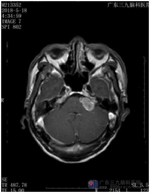 几个月前出现头晕,以为自己长时间低头工作,颈椎有问题,在医院多次针灸、按摩等治疗。直到一次晕倒后,被送去当地医院行CT检查,才发现是“左侧桥小脑角占位”。广东三九脑科医院进一步头颅MRI检查,提示:左侧桥小脑角区占位性病变,考虑听神经鞘瘤可能性大,病灶大小约2.6cm×2.7cm×2.3cm。