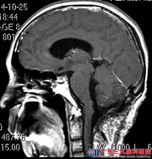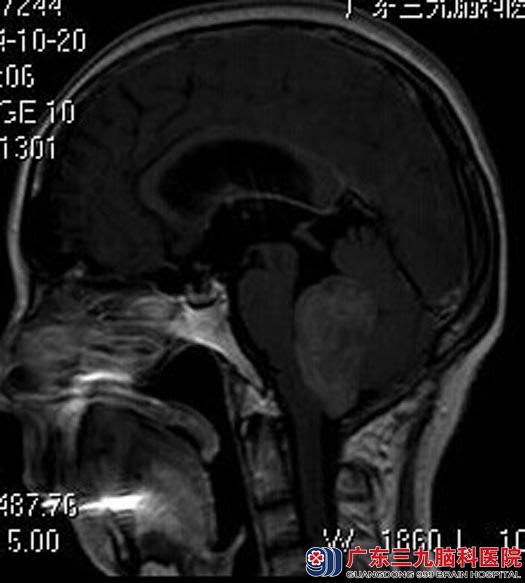 广东三九脑科医院头颅MR检查提示:四脑室内及右侧侧孔区桥小脑区团片状异常信号,大小约48.8 mm×37.2 mm×50.6mm,肿瘤与脑干粘连。