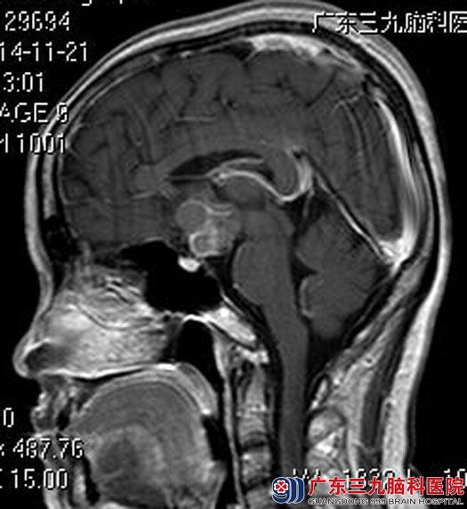 近三个月来出现双眼视物模糊,后枕部头痛,伴有多饮多尿,当地医院头颅CT检查提示颅内鞍区病变。广东三九脑科医院进一步头颅MR检查提示:鞍上池内见一类圆形囊实性占位性病变,大小约24.4mm×28.8mm×27.5mm,考虑颅咽管瘤可能性大。