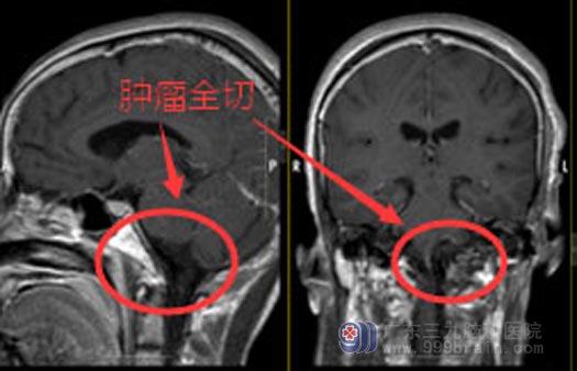 6天前,秦阿姨来到了广东三九脑科医院,头颅MR检查结果:左侧颈静脉孔区跨颅内外(颅内以左侧桥小脑角区为主)囊实性占位性病变,病灶整体范围约2.8cm×1.7cm×3.1cm,邻近脑干、左侧小脑半球受压,考虑为神经鞘瘤可能性大。医院副院长、神经外五科主任鲁明详细查阅了秦阿姨的影像资料,发现其左侧经静脉孔区跨颅内外有囊性病变,参考患者的临床表现,初步诊断是“左侧颈静脉孔区跨颅内外沟通舌下神经鞘瘤”。