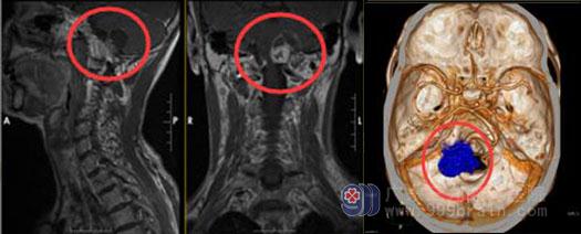 一个月前,她突然出现恶心、呕吐,走路不稳,当地医院头颅CT提示“左侧桥小脑角占位性病变”。