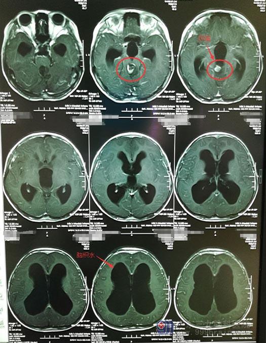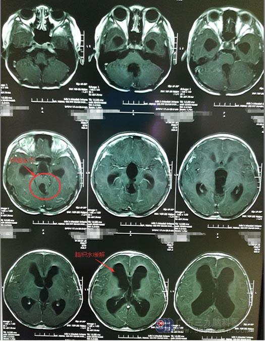 近一个月来,小茵又出现间断的头痛头晕症状,同时伴有呕吐。敏感的小茵父母立马带着她来到广东三九脑科医院复查,结果发现术区中脑导水管残留病变较前增大,病变大小约1.4cm×1.5cm×1.6cm,伴有梗阻性脑积水。