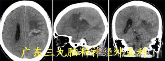 术后经过康复患者由术前昏迷恢复清醒,言语对答切题,左侧肢体肌力3 级,右侧肢体肌力正常。
