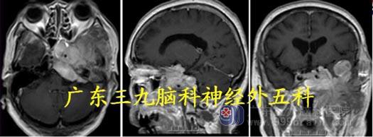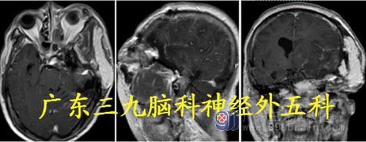 头颅MR:左侧中颅窝示一团块状跨颅内外生长占位性病变,增强后呈明显异常强化影,向内累及左侧海绵窦,包绕左侧颈内动脉,向外下累及蝶骨、左侧岩尖,并突入蝶窦及左侧颞窝,左侧咬肌及翼外肌受累,向后累及斜坡,范围约为8.2cm×7.2cm×6.5cm,左侧中颅窝跨颅内外占位性病变,考虑为脑膜瘤复发可能。