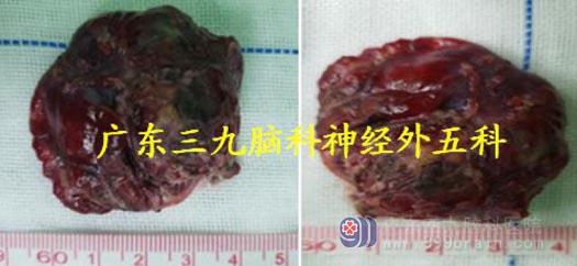见肿瘤呈囊实性,打开囊壁,吸除淡黄色囊液,见灰褐色瘤结节位于左侧小脑,质软、血管丰富并杂乱生长、无包膜,边界较清,显微镜下分块全切除肿瘤,大小约2*2*2cm。