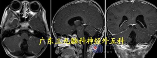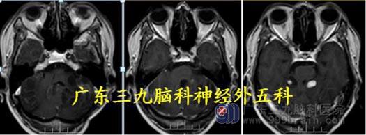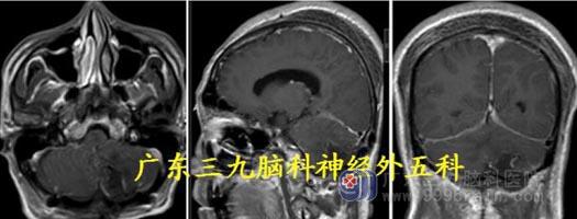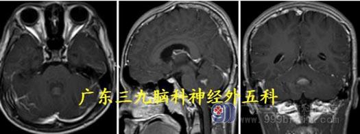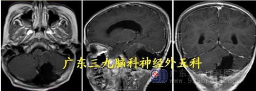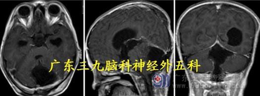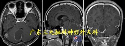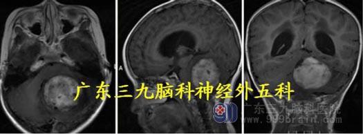 化,边缘不光整。考虑血管母细胞瘤及幕上梗阻性脑积水。
