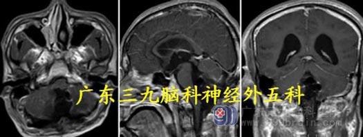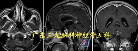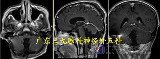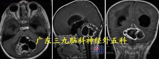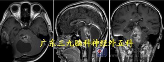 头颅MR:四脑室-脑干背侧示不规则囊实性占位病变呈长T1 长、短T2 混杂信号,FLAIR 序列呈高低混杂信号,增强后明显不均匀异常强化,范围约64.6mm×36.3mm×44.9mm,部分凸入上段椎管。考虑室管膜瘤可能性大。