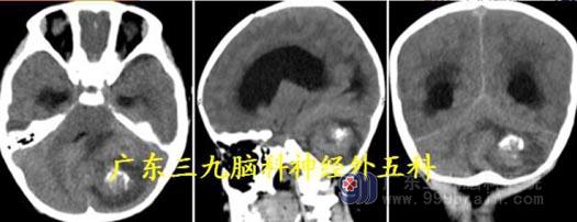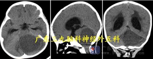 头颅CT:左侧小脑示一类圆形占位性病变,呈低密度影,幕上脑积水(中度)。