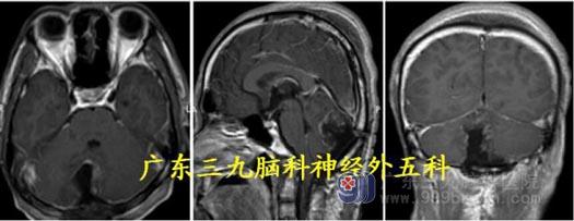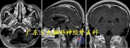 术中肿瘤镜下全切,小脑扁桃体下疝明显,切除部分小脑扁桃体减压。