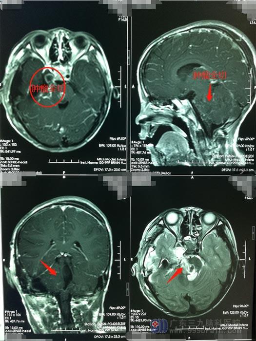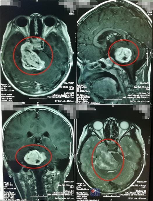 在广东三九脑科医院进一步影像检查后,诊断:右侧中后颅窝巨大三叉神经鞘瘤。