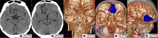 术前头颅CT、CTA示右侧额叶底部镰旁占位性病变,其实性部分示稍多细小血管影,邻近双侧大脑前动脉局部受压左偏。