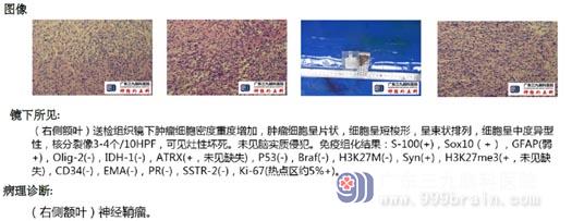 女,19岁。因头痛2周入院,外院影像学检查发现前颅窝底肿瘤。查体:神清,语利。双侧瞳孔等圆等大,直径约2.5mm,对光反射灵敏,视力、视野正常,双侧鼻唇沟对称,伸舌居中,颈软,四肢肌力、肌张力正常,感觉正常。生理反射存在,病理反射未引出。术前诊断:右侧前颅窝底占位性病变,成人型弥漫性胶质瘤(或)不典型炎性肉芽肿病变?在全麻下行冠状皮瓣右额开颅、右额底肿瘤切除术,术中冰冻报告为肿瘤细胞呈梭形,部分呈漩涡状排列,呈中度异形性,考虑为神经纤维瘤可能。予以全切。术后病理诊断为神经鞘瘤。术后病人恢复良好。此病例为嗅神经鞘瘤。据文献报道,起源于前颅窝底的嗅神经鞘瘤极为罕见。