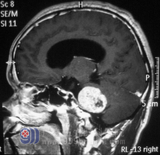 区先生,今年44岁。五年前开始出现右耳听力下降,间断头晕,呈阵发性,当地医院考虑是五官科问题,予对症治疗后症状无明显好转,且右耳听力下降不断加重。三个月前,他逐渐出现双眼视力下降,间断头晕伴有恶心感。头颅CT检查,结果提示“右侧桥小脑角区占位,约3.5cm×3.2cm,考虑听神经瘤,伴梗阻性脑积水”。