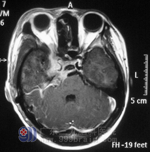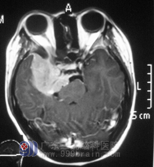 广东三九脑科医院综合神经外科 鲁明主任查阅影像资料发现:肿瘤侵润海绵窦,颅内外沟通,经CT检查见蝶骨及斜坡右侧、右侧颞骨岩部、额骨底部右侧骨质异常,经耳鼻喉科活检排除鼻咽癌。