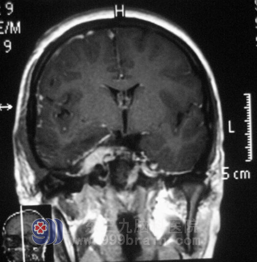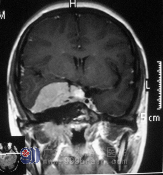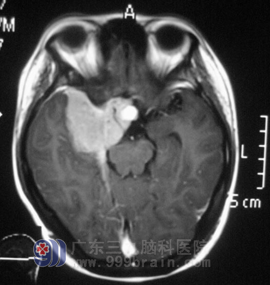 小李在2008年高考那年,出现右眼视力下降,以为是高负荷的复习迎考,造成视力出现问题。一年前右耳听力开始进行性下降,前十多天又出现了右耳失聪,外院行头颅MR检查提示:右侧眶内、中颅窝底、岩斜区占位,病变大小4.98cm×3.34cm×2.62cm,主要位于中颅窝,小部分累及后颅窝,脑干受压。