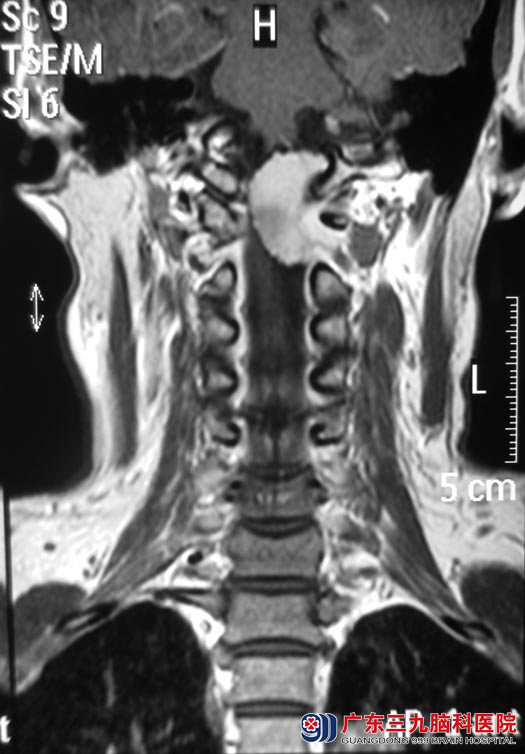 入住广东三九脑科医院综合神经外科时查体:右侧浅感觉较左侧差,悬雍垂向右侧,左侧咽反射减弱,左侧耸肩转头运动减弱,舌左偏;复查脑部MR见:枕骨大孔区级上颈段椎管内示一不规则形占位性病变,病变以宽基底与斜坡后方硬脑膜及颈1-2椎体后方硬脊膜相连,大小约20.5mm×12.0mm×32.5mm,延髓及上颈段脊髓受压、变形,并向右偏移;头颈CTA检查提示:枕大孔区占位性病变,血供较丰富,左侧椎动脉被包绕可疑。