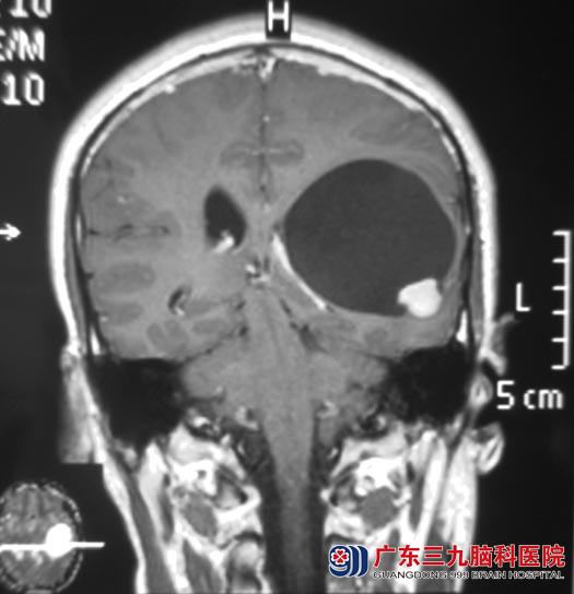 随后,阿丰出现头痛,家里人不放心,劝他去医院做体格检查。头颅CT检查提示:左侧颞顶叶占位性病变,考虑肿瘤性病变。广东三九脑科医院MR检查显示病变大小约6.26cm×5.94cm×5.66cm。