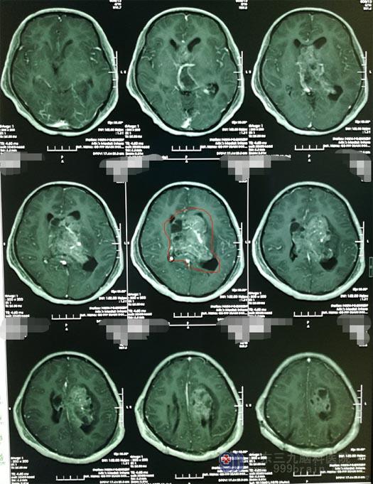 在广东三九脑科医院行头颅MR检查,提示:孟氏孔-双侧侧脑室内占位性病变,大小约7.7cm×5.7cm×5.9cm,考虑中枢神经细胞瘤;头颅CTA示:双侧侧脑室体部巨大占位性病变并出血及钙化,其内血管极其丰富,左侧脉络膜前动脉增粗并供血,伴有粗大引流静脉引流至大脑大静脉。