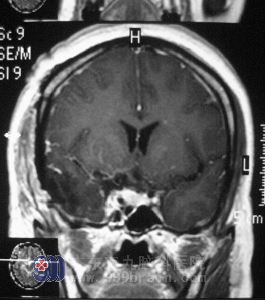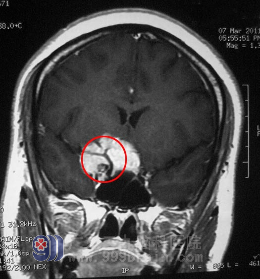 经过反复掂量,他们选择了广东三九脑科医院,在我院辅助检查后发现:肿瘤大小约4.3*4.2*4.5cm,是位于不同部位的脑膜瘤,会造成相应的神经功能缺损:蝶骨嵴内侧型脑膜瘤会造成视野缺损、小脑桥脑角脑膜瘤会造成小脑损害、脑室内脑膜瘤会造成脑脊液循环障碍,而深部脑膜瘤,肿瘤与神经、血管、脑干及丘脑下部紧密粘连,不易分离,肿瘤不易切除。在手术上,蝶骨嵴内侧型脑膜瘤位于右侧前中颅窝底,手术全切除难度大,而许女士的脑膜瘤巨大,侵犯至周围重要生命中枢,手术难度更大。http://www.999brain.com/