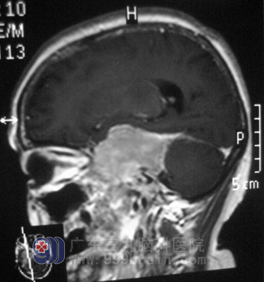 60岁的刘女士,六年前无明显诱因出现右侧肢体乏力,以上肢为甚,进行性加重,以为是风湿、疲劳引起,也就没有去医院进行治疗。一年多前开始出现吞咽困难,并且症状逐渐加重,同时伴有视物模糊,服用多种药物治疗,效果欠佳。今年2月去当地医院行头部MRI检查,提示“右侧鞍旁巨大占位性病变,大小约52.5mm×8mm×64.1mm”,原来这就是折腾了刘女士6年的病根: