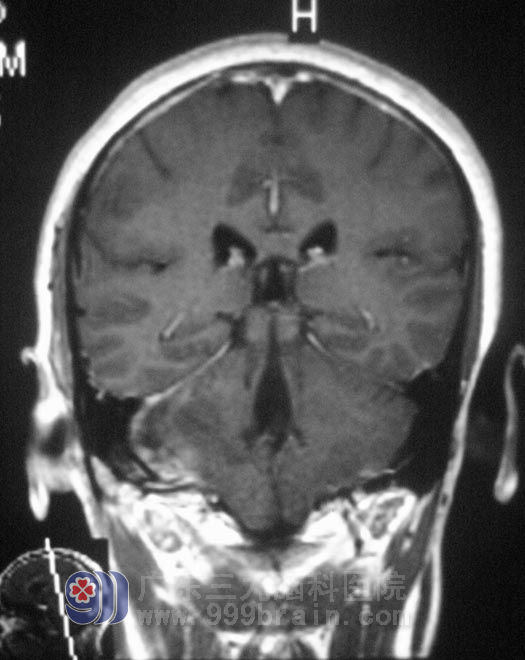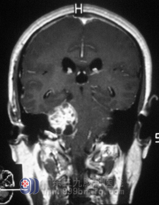 在广东三九脑科医院综合神经外科就诊,头颅MR提示:右侧桥小脑角区占位,大小53.2mm×26.1mm×49.9mm,初步考虑为听神经瘤。在五官科治疗5年无果,祸根竟然又是脑肿瘤。