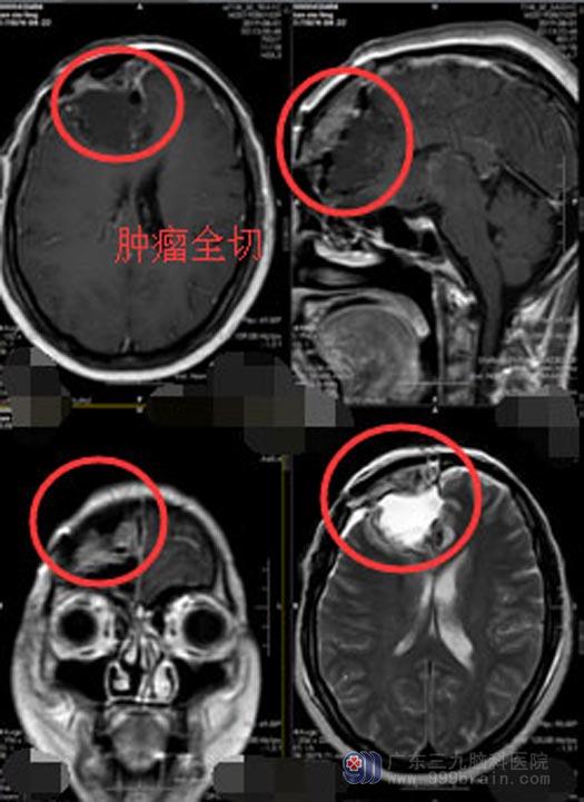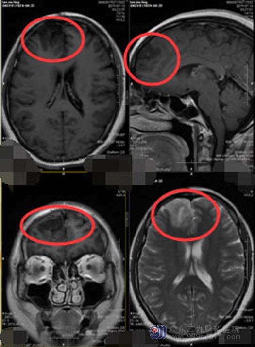 在广东三九脑科医院神经外五科进一步MR平扫+增强等检查,诊断:1.右侧额叶占位:少突胶质瘤?弥漫性星形细胞瘤?医生告诉谭阿姨:脑肿瘤除了头痛、恶心、呕吐等常见症状,有些肿瘤患者会出现其它的伴随症状,据文献报道,其发生率可高达25%~40%,有时可表现为傻笑、语言错乱、定向障碍、缺乏自制力等。