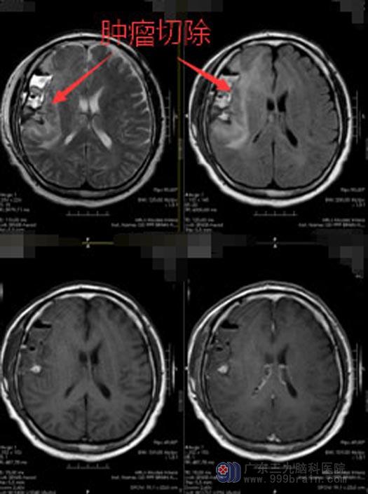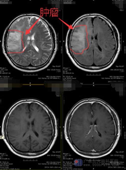 进一步的脑部核磁共振检查发现:右侧额颞岛顶叶、右侧基底节区、双侧丘脑、胼胝体、左侧额顶叶弥漫性病变,考虑为肿瘤性病变,弥漫性星形细胞瘤可能,局部不除外有间变可能。