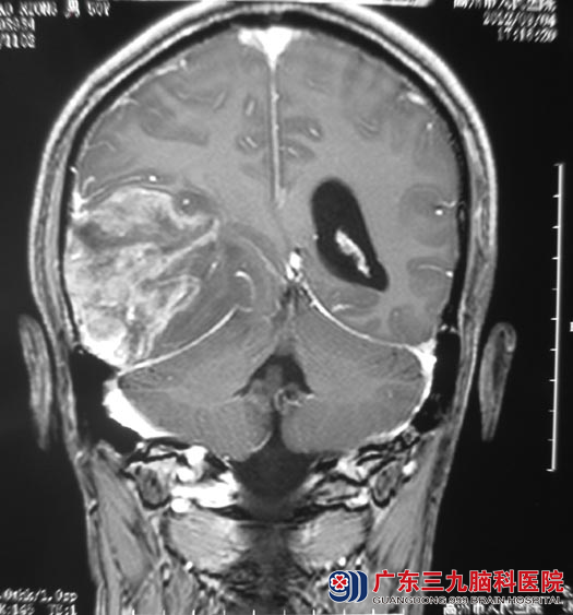 这是肖先生的MR检查,提示:右侧颞枕顶叶占位,大小5.4cm×7.5cm×6.1cm,考虑胶质瘤。是他五天前突然出现双眼视物重影才得以发现。http://www.999brain.com/