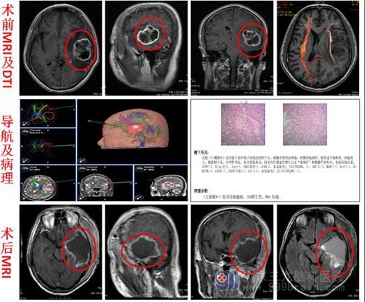 在患者及家属的积极要求下,由鲁明副院长主刀,在唤醒麻醉下行“左侧颞叶占位病变切除术”,术前导航定位肿瘤边界及标记,术中见皮层下灰白色肿瘤组织,取部分肿瘤组织送快速冰冻:高级别胶质瘤。边切除肿瘤边与患者沟通,查看患者言语及肢体运动情况,予显微镜下分块切除,手术历时7个小时,过程顺利。术后病理:胶质母细胞瘤,WHO IV级。