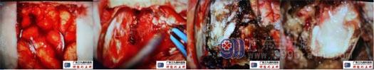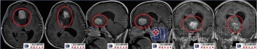 术中行右侧额叶造瘘,逐步深入,见灰白色肿瘤组织,部分呈胶冻状,部分质地稍韧,伴有局部囊变,血供丰富,与周围组织界限不清,包绕双侧大脑前动脉,取部分瘤组织送冰冻切片,提示高级别胶质瘤,在显微镜下于中央前回前方沿非功能区正常脑组织边界大块切除肿瘤组织、突入右侧侧脑室内的肿瘤组织以及额极脑组织。由于肿瘤外侧与基底节区、丘脑关系密切,故行次全切除。右侧侧脑室前角用补片予以封堵。