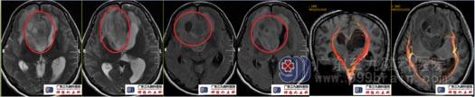 术前头颅MRI示右侧额颞叶、右侧基底节区、透明隔区及左侧额叶示一团块状不均匀长T1、长T2异常信号影,Flair序列呈高信号,间杂囊状明显长T1、长T2异常信号影,范围约62mm×56mm×43mm,增强后病变局部片状、斑片状、环状不均匀异常强化,周围示斑片状Flair序列高信号水肿影,累及胼胝体压部,视交叉、右侧大脑脚、右侧侧脑室前角、第三脑室、双侧侧脑室室间孔不同程度受压。ASL:右侧额颞叶、右侧基底节区、透明隔区及左侧额叶团块状病灶变低-稍高灌注;DTT(白质纤维束三维重建)右侧额颞叶、透明隔区及左侧额叶团块状病灶内纤维紊乱、中断;右侧皮质脊髓束显示稍稀少;双侧枕额束前份、右侧扣带束显示稀少;胼胝体束显示紊乱,请结合临床。影像学诊断:右侧额颞叶、右侧基底节区、透明隔区及左侧额叶占位性病变,考虑偏高级别成人弥漫性胶质瘤。