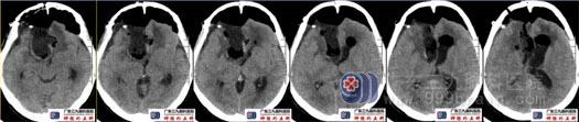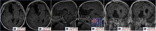 术后复查头颅MRI示原病灶已大部分切除,幕上梗阻性脑积水并室周间质性水肿较前减轻。