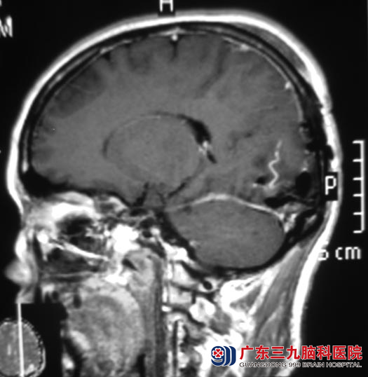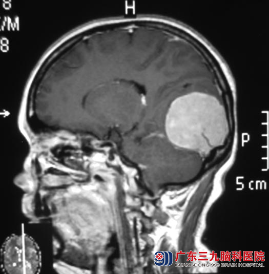 广东三九脑科医院进一步头颅MR检查:左侧枕部示一类圆形占位性病变,大小约41.7mm×53.1mm×52.1mm,左侧颞枕叶脑组织受压。